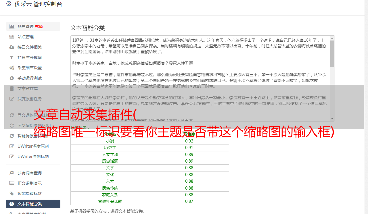 文章自动采集插件( 缩略图唯一标识要看你主题是否带这个缩略图的输入框)