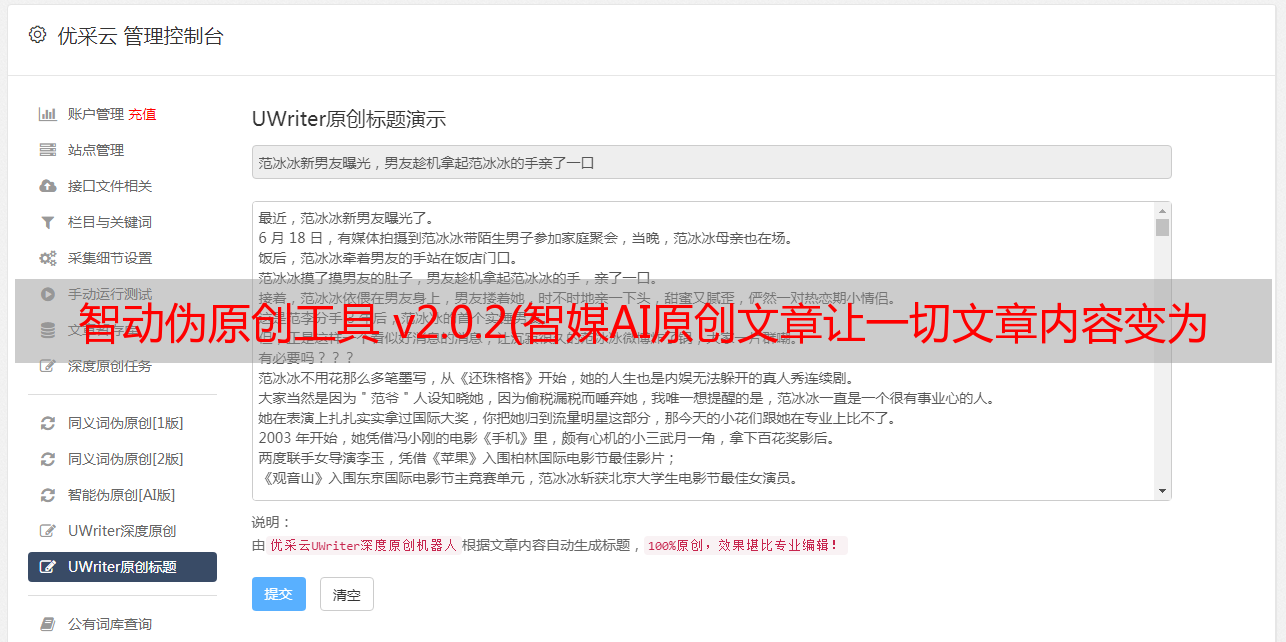 优采云 发布时间: 2021-10-16 16:12智动伪原创工具 v2.0.2(智媒AI原创文章让一切文章内容变为一篇全新升级的原创文章内容)