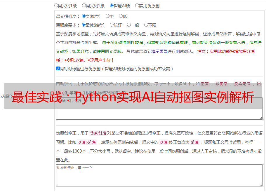 本文文章主要介绍了AI自动抠图示例分析的Python实现。通过示例代码对介绍进行了非常详细的介绍。它对每个人的学习或工作都有一定的参考学习价值。有需要的朋友可以参考