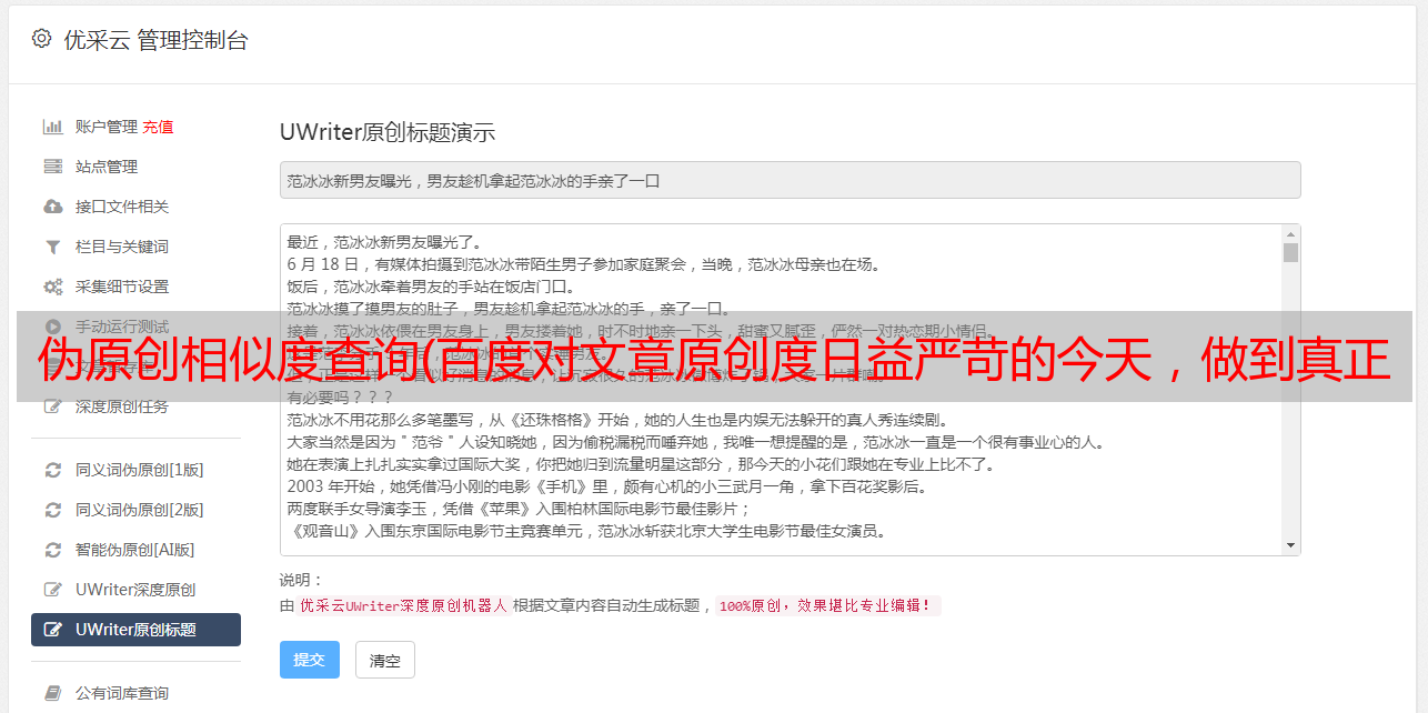 优采云 发布时间: 2021-10-17 12:24伪原创相似度查询(百度对文章原创度日益严苛的今天,做到真正的“原创”)