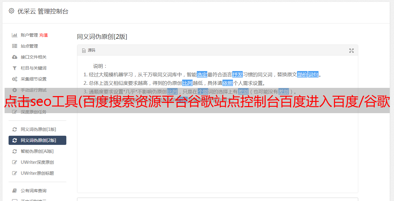 优采云 发布时间: 2021-10-18 05:16点击seo工具(百度搜索资源平台谷歌站点控制台百度进入百度/谷歌搜索引擎