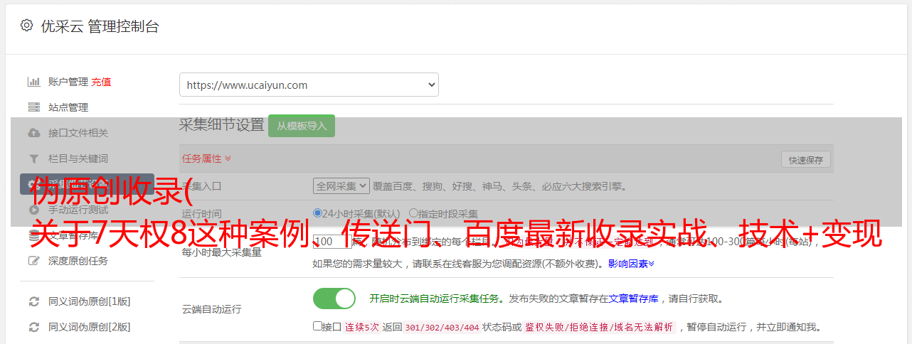先说网站文章不用伪原创这块,那关于伪原创,在网上,各大seo群里,也有比较多的讨论。话题,毕竟网站还是靠文章吃饭,有没有文章可谈收录?毕竟,收录 越多,只要词库发布高,权重就越大。但是,如果我个人做一些文章,如果你手动复制粘贴,非常非常累人,而且速度也没有太大提升,所以很多大佬想到了采集软件,通过市面上的一些采集器比如优采云等等,有的大佬做了很多伪原创,有的有排名,有的没有,那你就分析一下是否需要做还是不做?