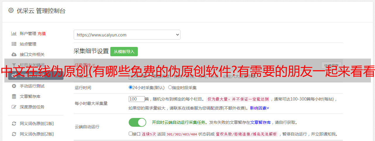 7.优采云文章伪原创 工具:优采云AI伪原创工具,是一款功能强大的文章伪原创工具也是人工智能写作助手。对全文进行语义分析后,可以智能修改句子,生成文本。凭借其强大的NLP、深度学习等技术,可以轻松通过原创度检测。