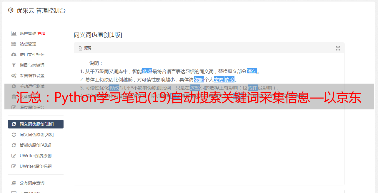 优采云 发布时间: 2020-12-21 08:12汇总:Python学习笔记(19)自动搜索关键词采集信息—以京东为例