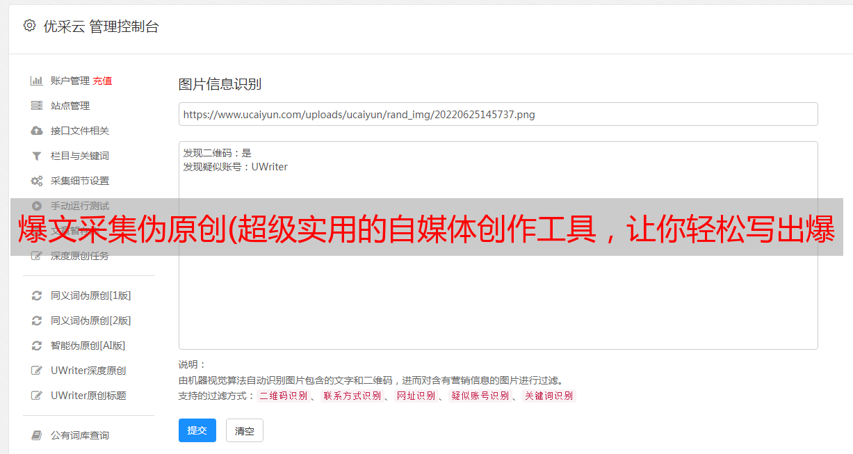 这个网站可以绑定一些自媒体平台账号。也就是说,你在今日头条这样的自媒体平台上发布后,可以直接用这个同步到其他你要发布的自媒体平台。这大大减少了工作量。同时网站还有热点、采集爆文、海量图库、营销日历,网站自带伪原创检测功能,很实用~~