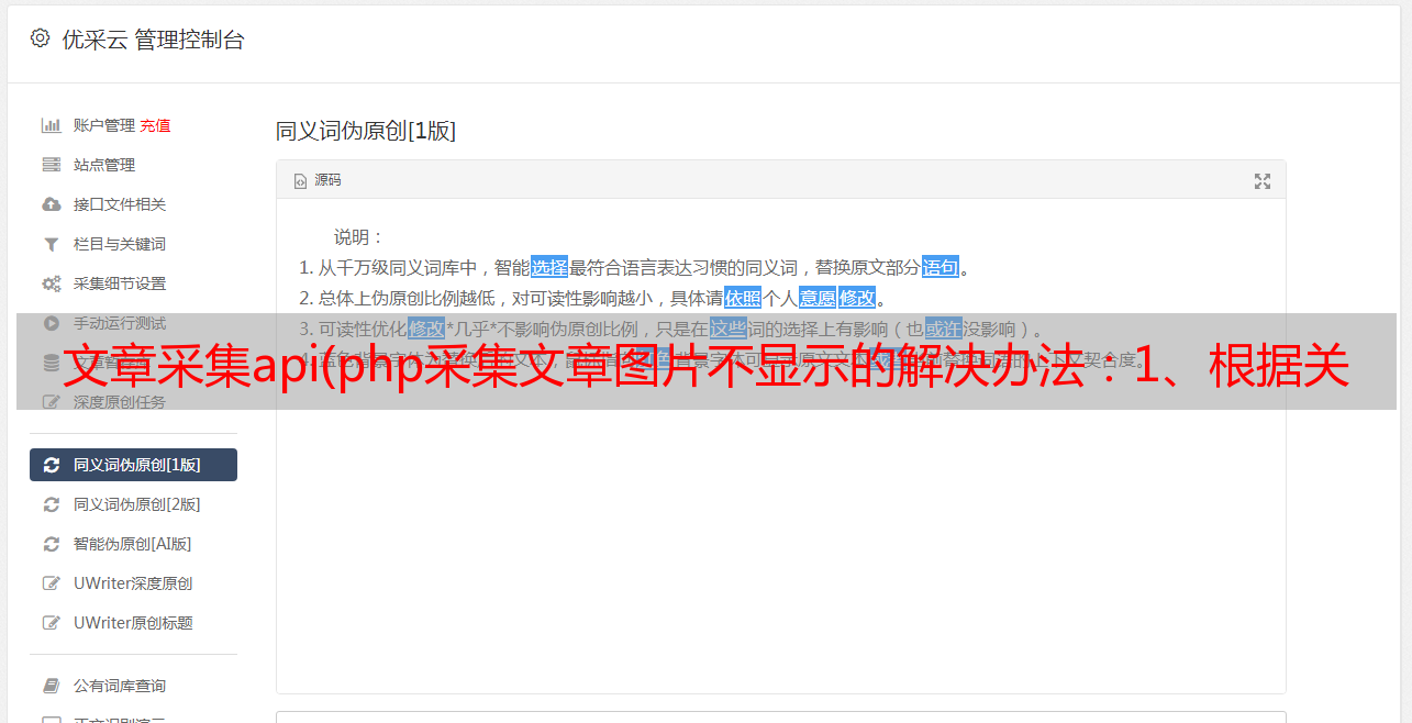 优采云 发布时间: 2021-10-22 21:10文章采集api(php采集文章图片不显示的解决办法:1、根据关键字采集百度搜寻结果)