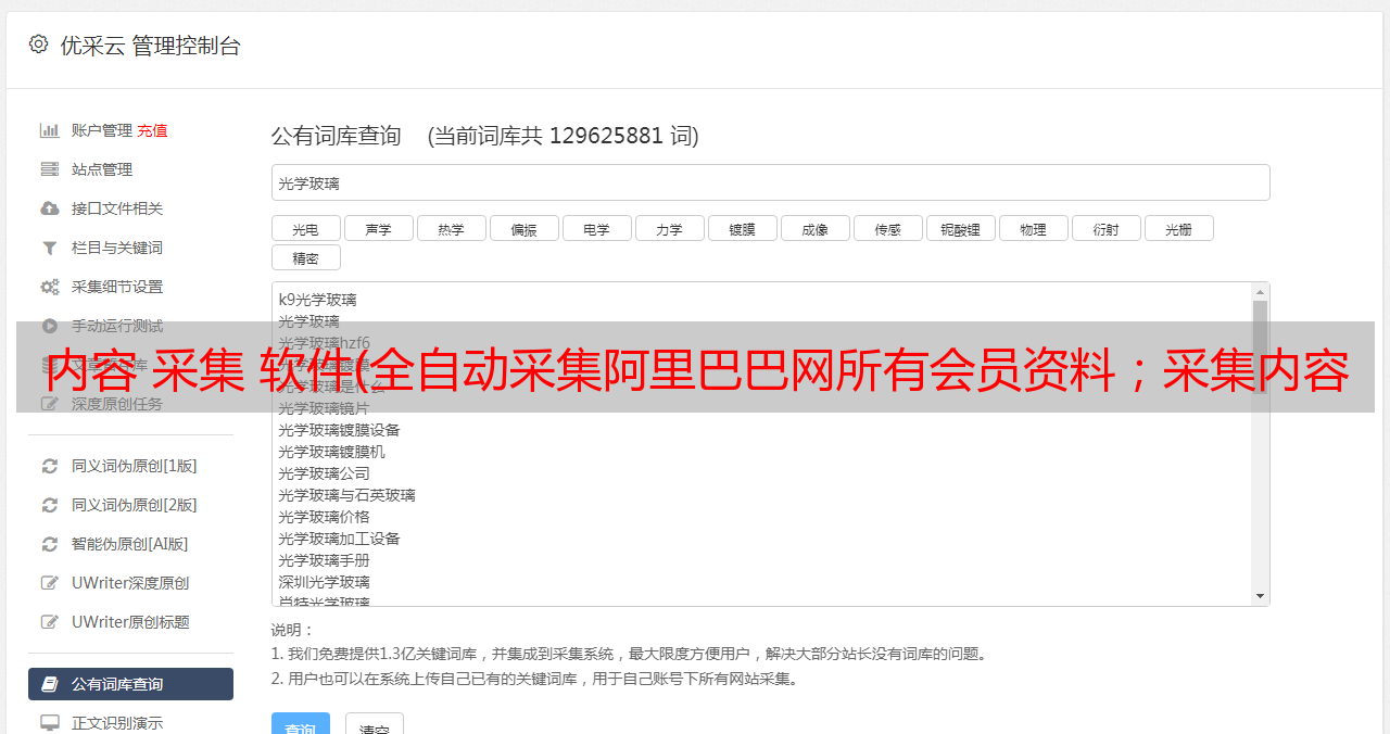 优采云 发布时间: 2021-10-23 02:18内容 采集 软件(全自动采集阿里巴巴网所有会员资料;采集内容可按省份、关键词、行业分类)