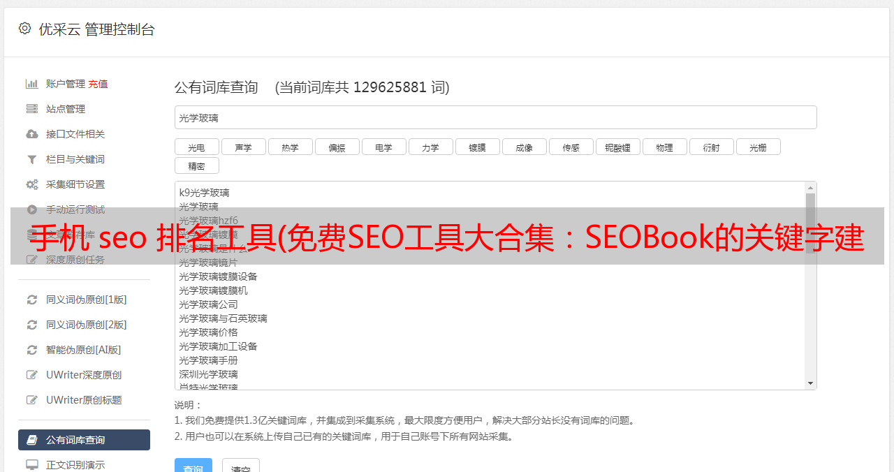 优采云 发布时间: 2021-10-23 18:11手机 seo 排名工具(免费SEO工具大合集:SEOBook的关键字建议工具费用)