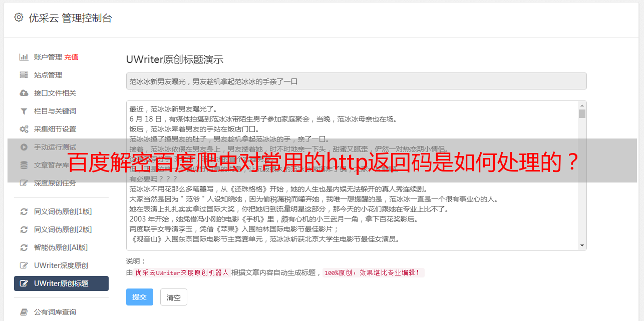 优采云 发布时间: 2020-06-30 08:00百度爬虫对常用的http返回码的处理逻辑?百度爬虫在进行抓取和处理时,是依据http合同规范来设置相应的逻辑的,因此,如果网站/页面发生一些非常状况或则网站某类页面集存在特殊性的时侯,我们必须晓得怎样处理能够更符合百度爬虫,以防止错误的措施给沈阳网站优化带来不必要的风险。在http状态码使用方面做了说明,主要涉及到常见的301、404、403、503状态码的处理建议,非常实用,结合这种知识以及往年遇见的实际情况我会做一点补充应用说明。