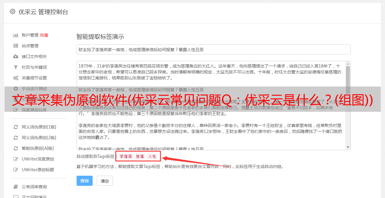 优采云是一款实用且专业的文章原创性别检测软件。它使用爬虫技术抓取行业数据集,并使用深度学习方法进行句法和语义分析。词之间的关系是从语义上下文的空间向量模型中挖掘出来的。采集文章、伪原创内容,检测文章原创性别等功能,帮助用户提高工作效率,节省工作时间。利用伪原创的功能提高文章的原创性能,原创高文章更容易被搜索引擎搜索收录@ >,并且内容创建者的效率得到提高。