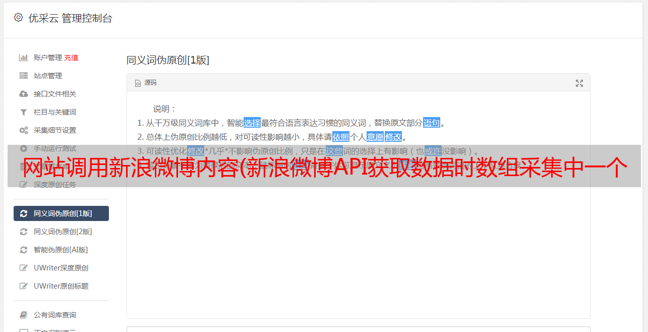 优采云 发布时间: 2021-10-26 15:20网站调用新浪微博内容(新浪微博API获取数据时数组采集中一个很好的方法)