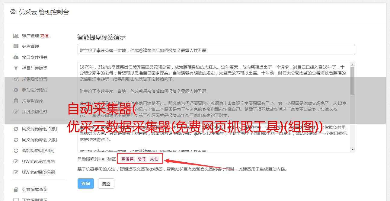 优采云Universal文章采集器可以帮你采集指定网站的文章内容,帮你搜索你需要的信息。软件具有智能搜索机制,可以高精度搜索文章指定的网站,不仅可以提高您的文章手机功能,