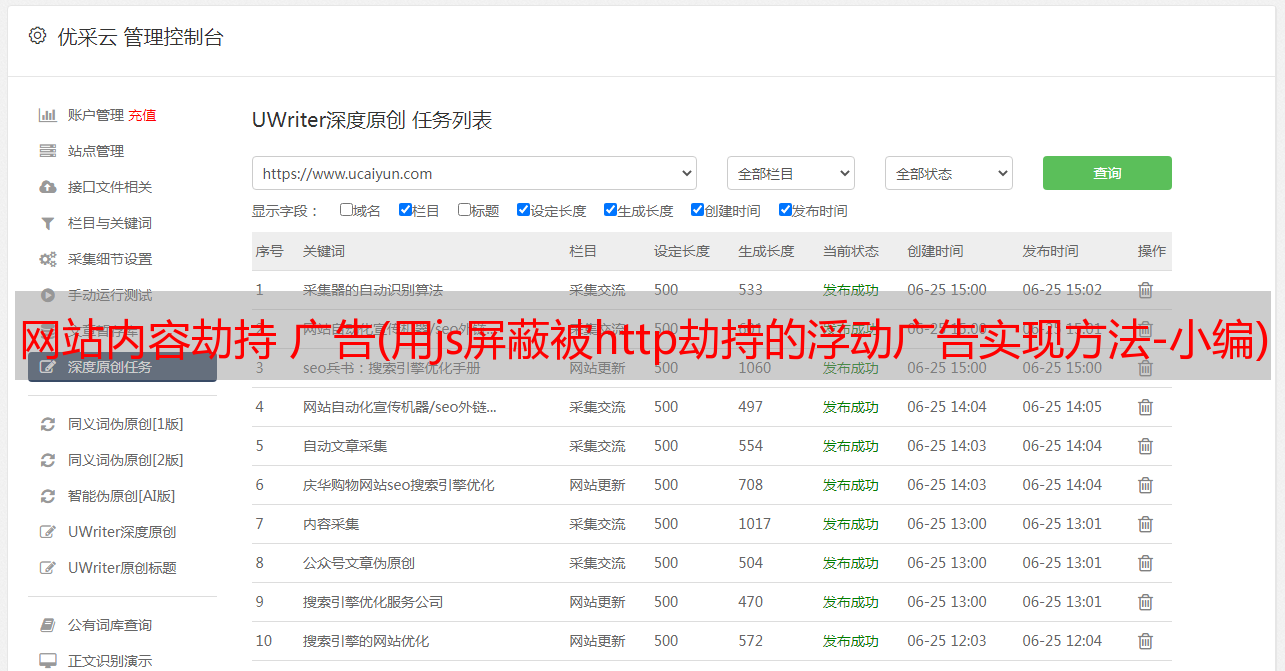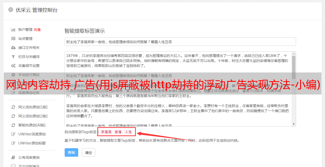 优采云 发布时间: 2021-10-29 13:15网站内容劫持 广告(用js屏蔽被http劫持的浮动广告实现方法-小编)
