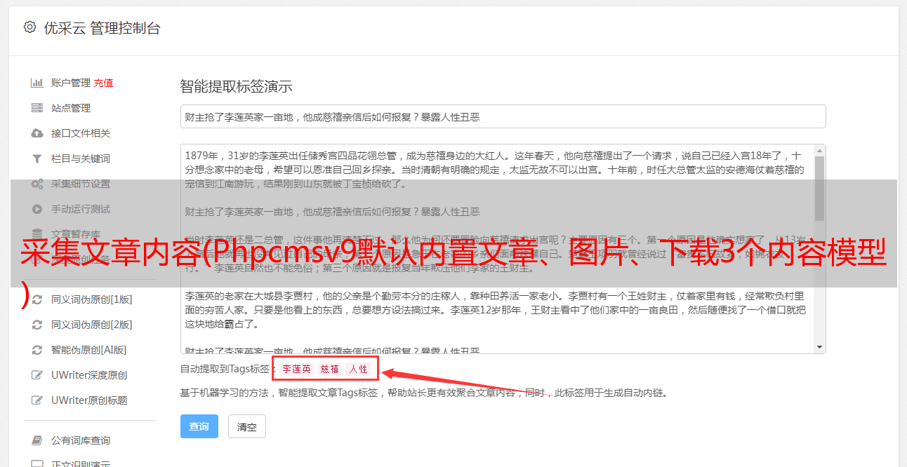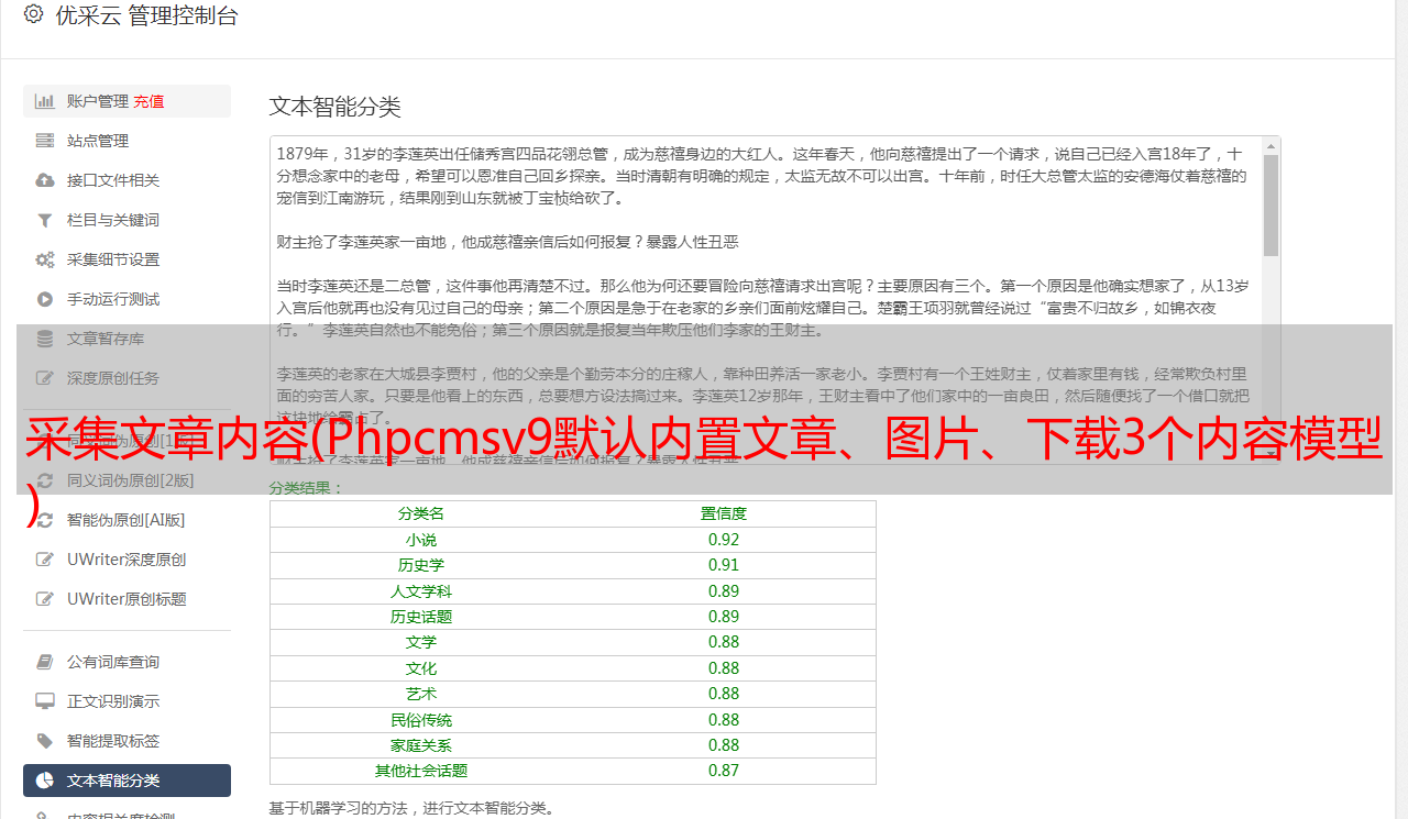 采集文章内容(Phpcmsv9默认内置文章、图片、下载3个内容模型 )