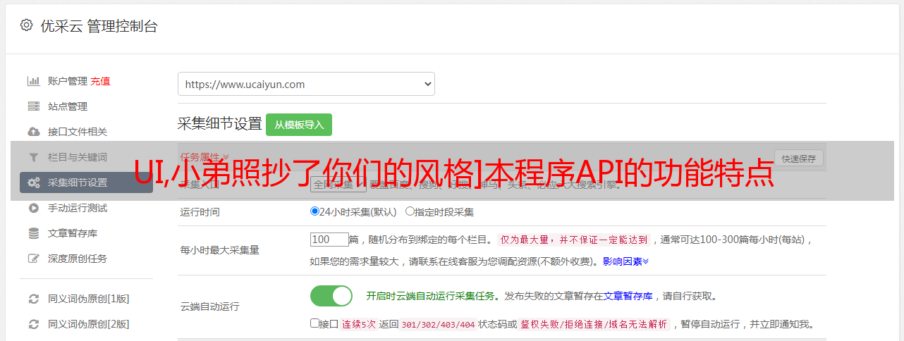 优采云 发布时间: 2021-03-20 21:15UI,小弟照抄了你们的风格]本程序API的功能特点