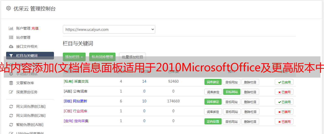 优采云 发布时间: 2021-10-31 09:12网站内容添加(文档信息面板适用于2010MicrosoftOffice及更高版本中的Word、ExcelPowerPoint和PowerPoint)