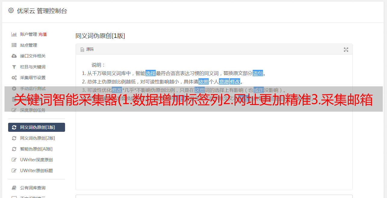 优采云 发布时间: 2021-11-01 04:19关键词智能采集器(1.数据增加标签列2.网址更加精准3.采集邮箱算法升级)