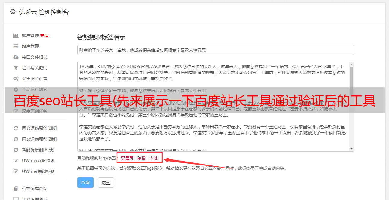 优采云 发布时间: 2021-11-02 03:11百度seo站长工具(先来展示一下百度站长工具通过验证后的工具全貌给力)