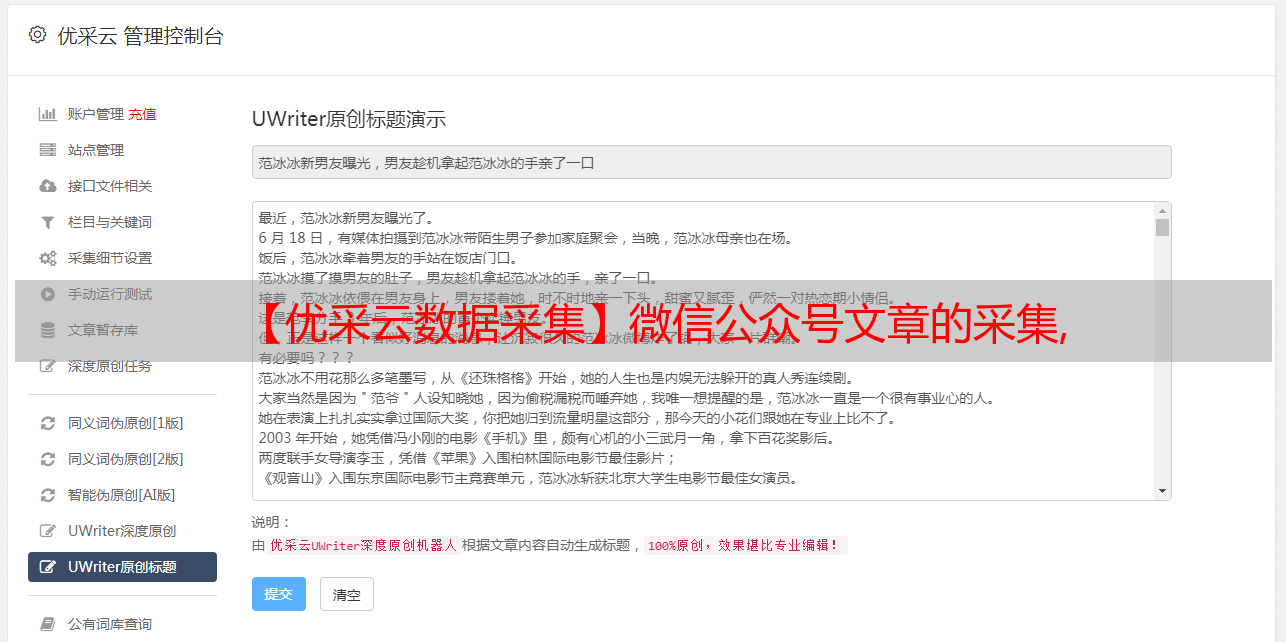 优采云 Data 采集平台为微信官方帐户文章提供了采集,并且可以轻松地发布到WordPress和其他系统。