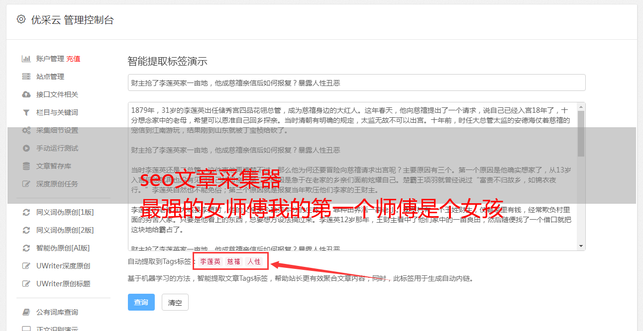 大师可以单独出去做的原因是,她写了一个类似于早期“ 优采云”现代基本“ Python”的核心程序,大量生产了内容并进行了人工替换,我们节省了很多搜索时间的内容,沉浸在整天的变化中文章。 (我不得不说坚持手动修改文章是最好的体验。阅读更多内容后,编写它并不难。)