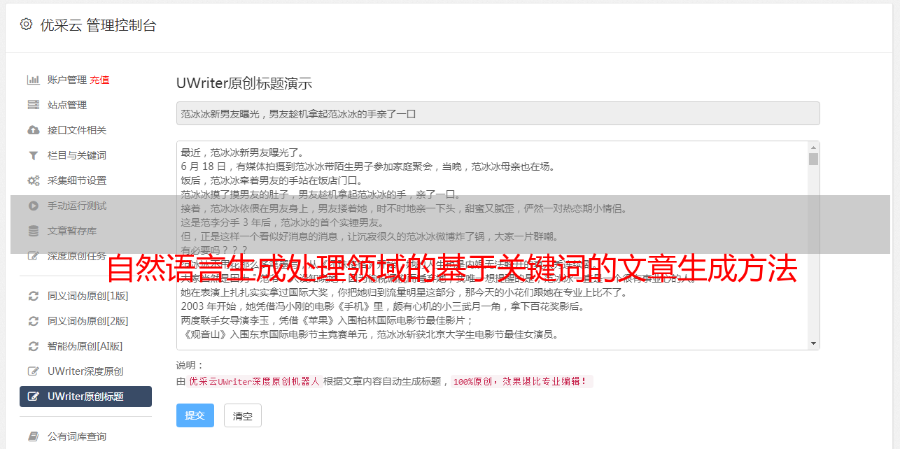 本发明提供了一种基于关键词的文章生成方法。该方法使用深度学习神经网络语言模型来计算单词向量,然后使用单词嵌入和位置代数来表征句子特征向量也被用于文本生成应用程序,从而摆脱了传统结构化数据生成和模板配置生成的刚性和局限性;采用新的基于句子的前向索引和倒排索引项目来实现在线计算服务。在线计算性能很高,并且可以重复生成具有多个文本语义角度的关键字文章;该方法提供了一种使用关键词生成文章的方法,包括基于关键词的文本文章生成算法,可以将句子的前向索引和关键词倒排索引的实现应用于基础服务。 AI智能产品。