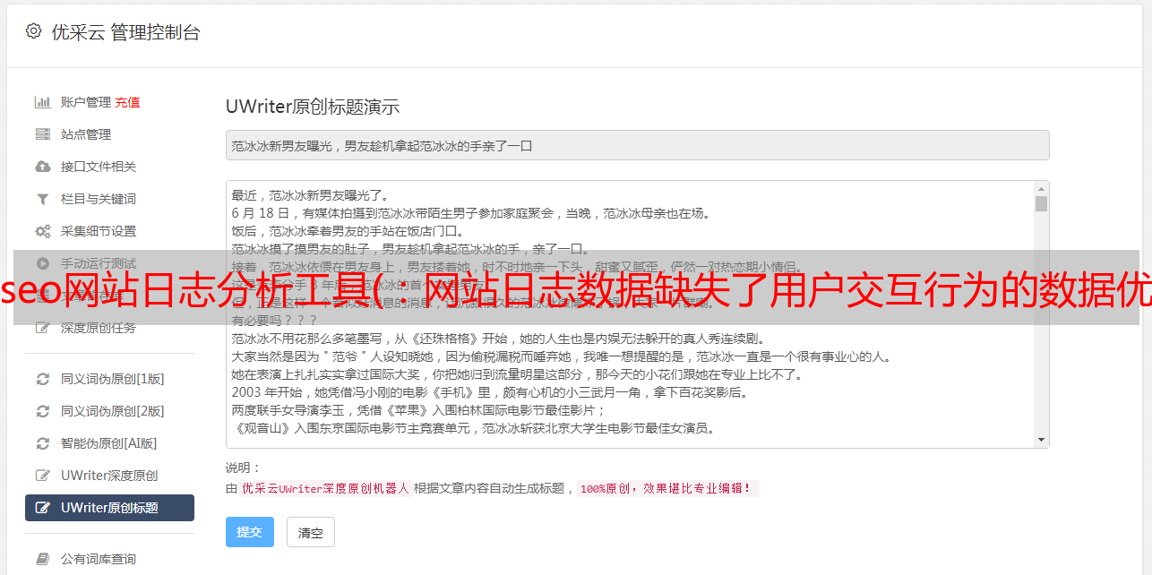 优采云 发布时间: 2021-11-07 19:22seo网站日志分析工具(:网站日志数据缺失了用户交互行为的数据优势