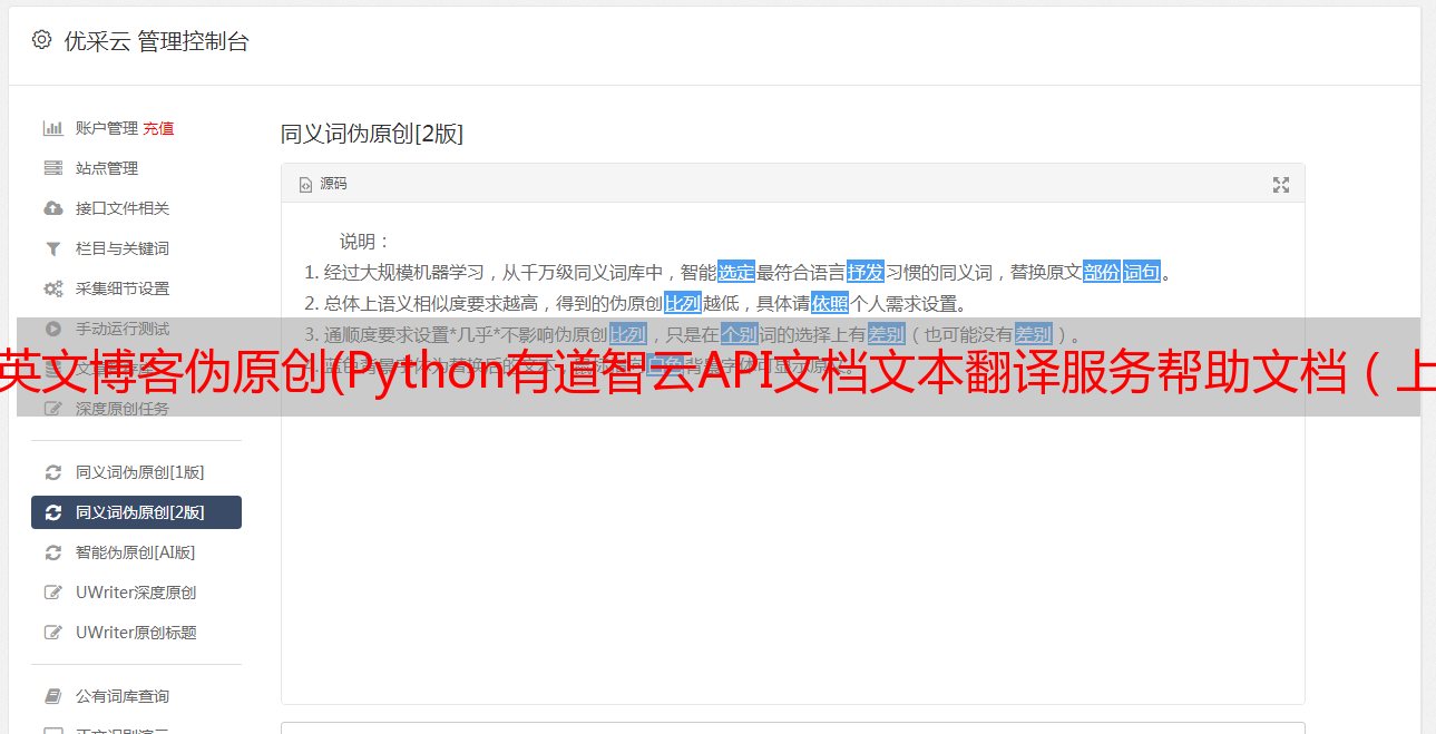 优采云 发布时间: 2021-11-08 11:03英文博客伪原创(Python有道智云API文档文本翻译服务帮助文档(上)