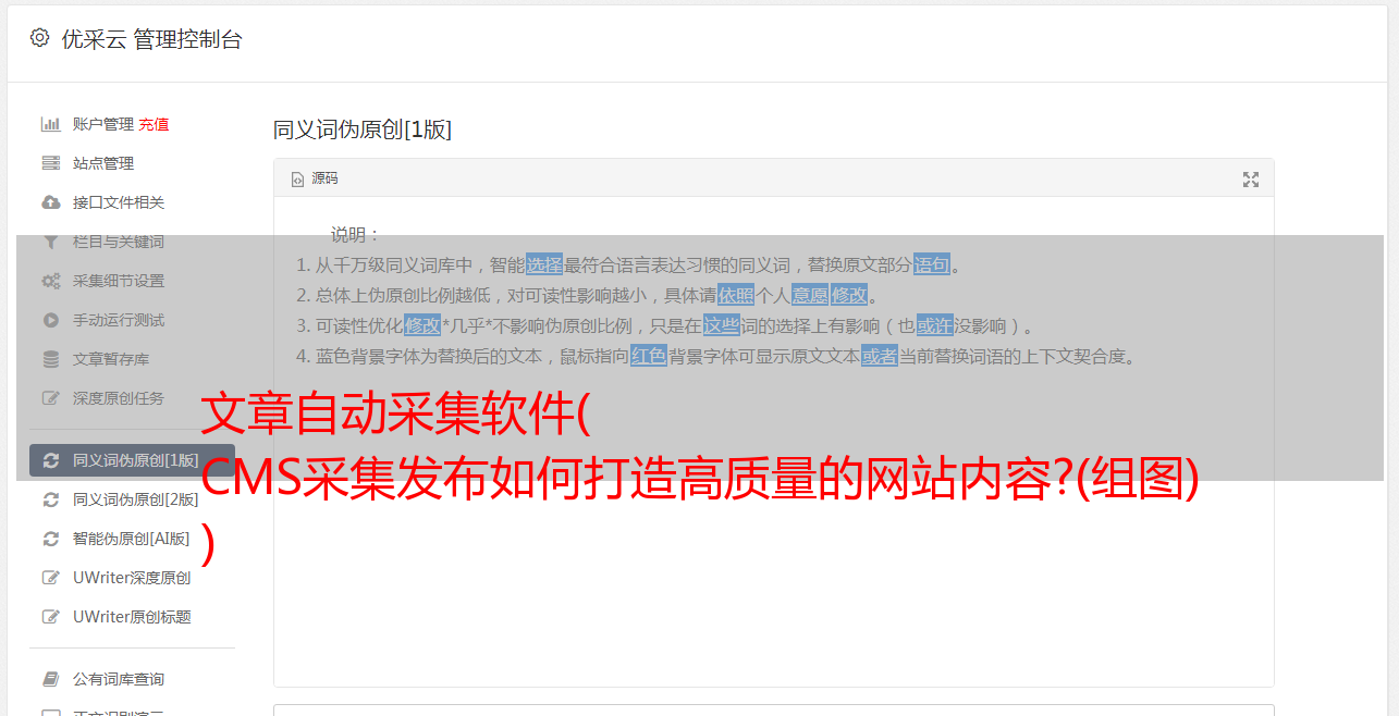 伪原创工具:与优采云、优采云等采集软件无缝对接,支持本地批量伪原创+支持网站API接口