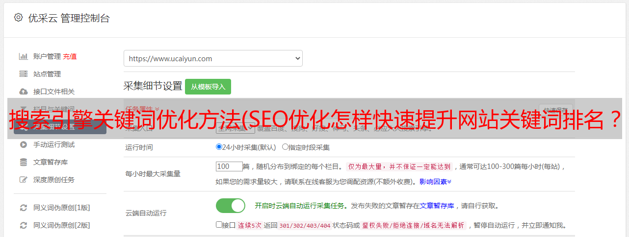 优采云 发布时间: 2021-11-09 06:20搜索引擎关键词优化方法(SEO优化怎样快速提升网站关键词排名?(图)!)