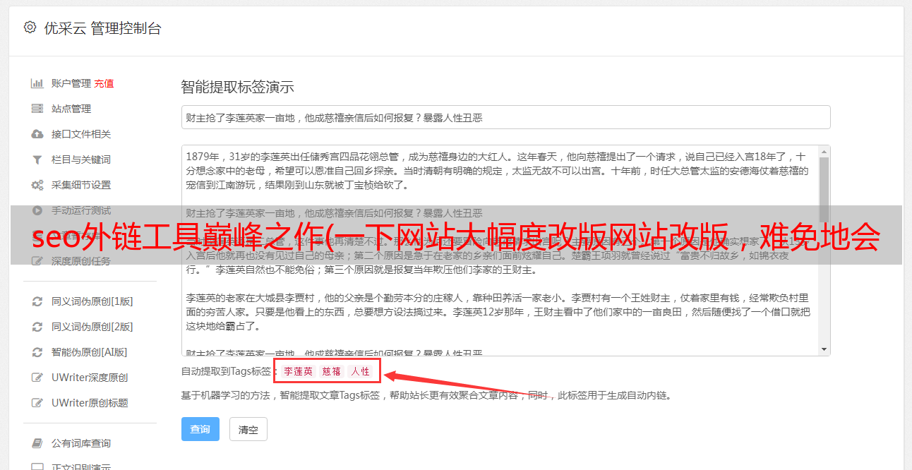 优采云 发布时间: 2021-11-09 11:03seo外链工具巅峰之作(一下网站大幅度改版网站改版,难免地会改造的原因!)