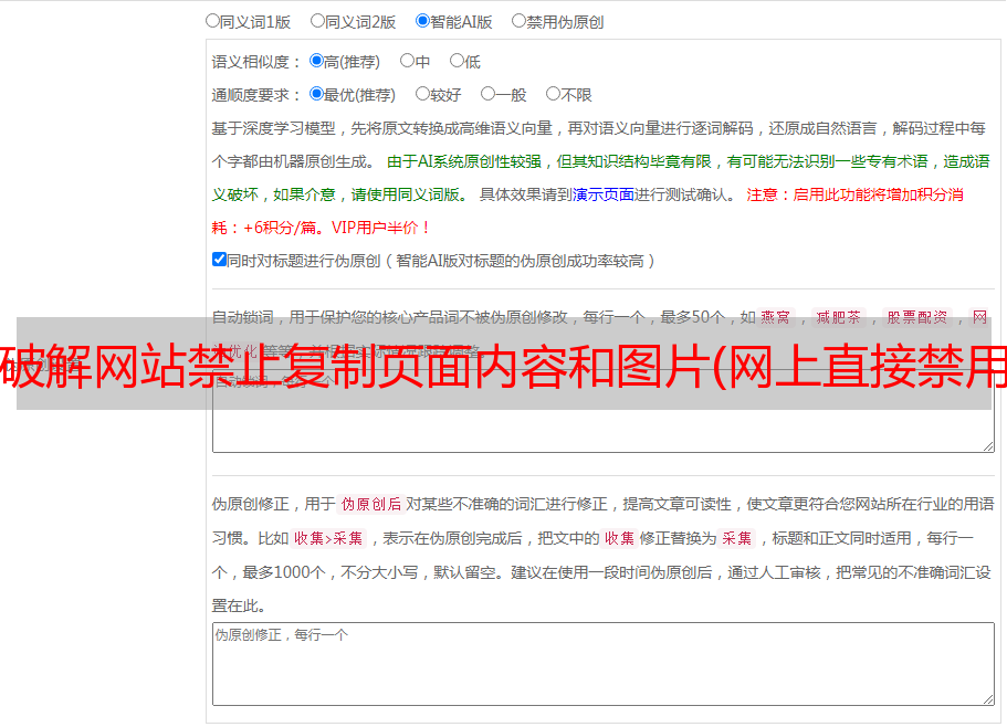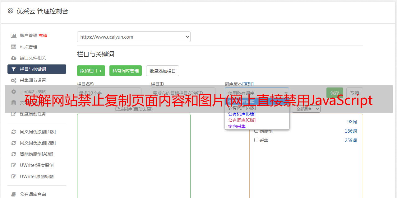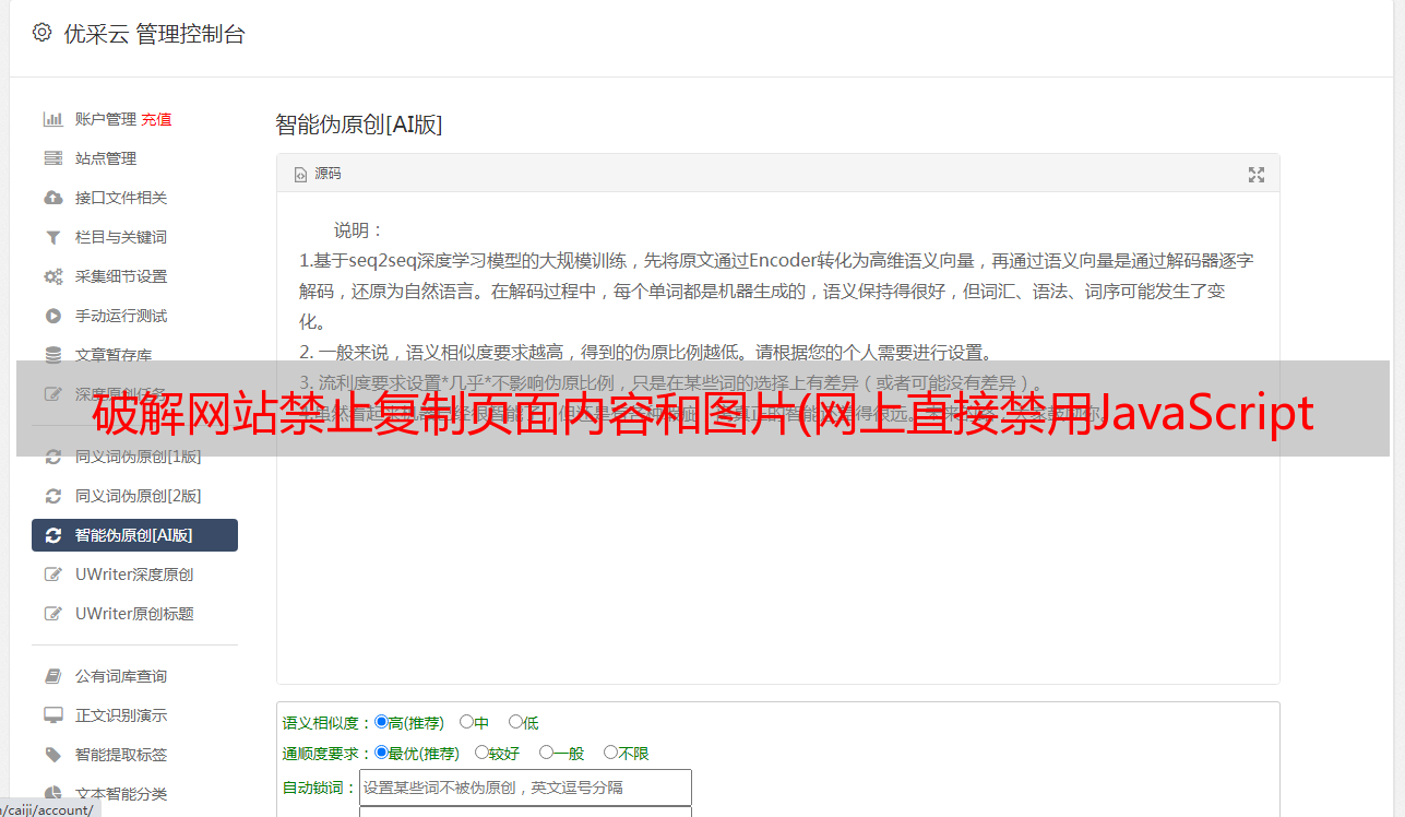 优采云 发布时间: 2021-11-10 22:11破解网站禁止复制页面内容和图片(网上直接禁用JavaScript办法问题多,就可以直接复制粘贴)