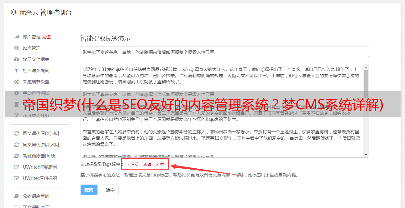 优采云 发布时间: 2021-11-12 22:24帝国织梦(什么是SEO友好的内容管理系统?梦CMS系统详解)