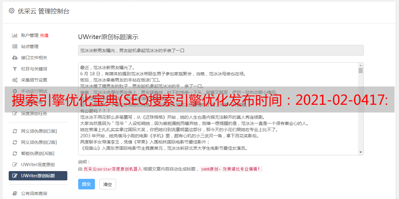 优采云 发布时间: 2021-11-13 14:26搜索引擎优化宝典(SEO搜索引擎优化发布时间:2021-02-0417:24作者)