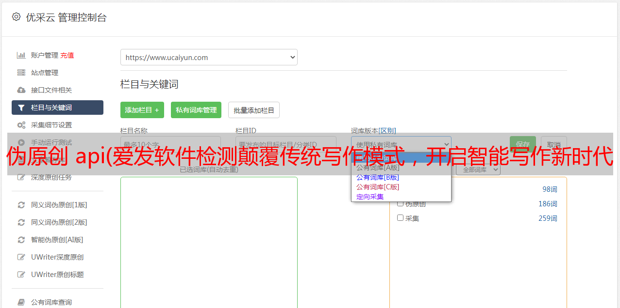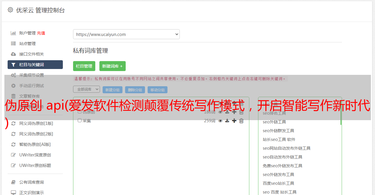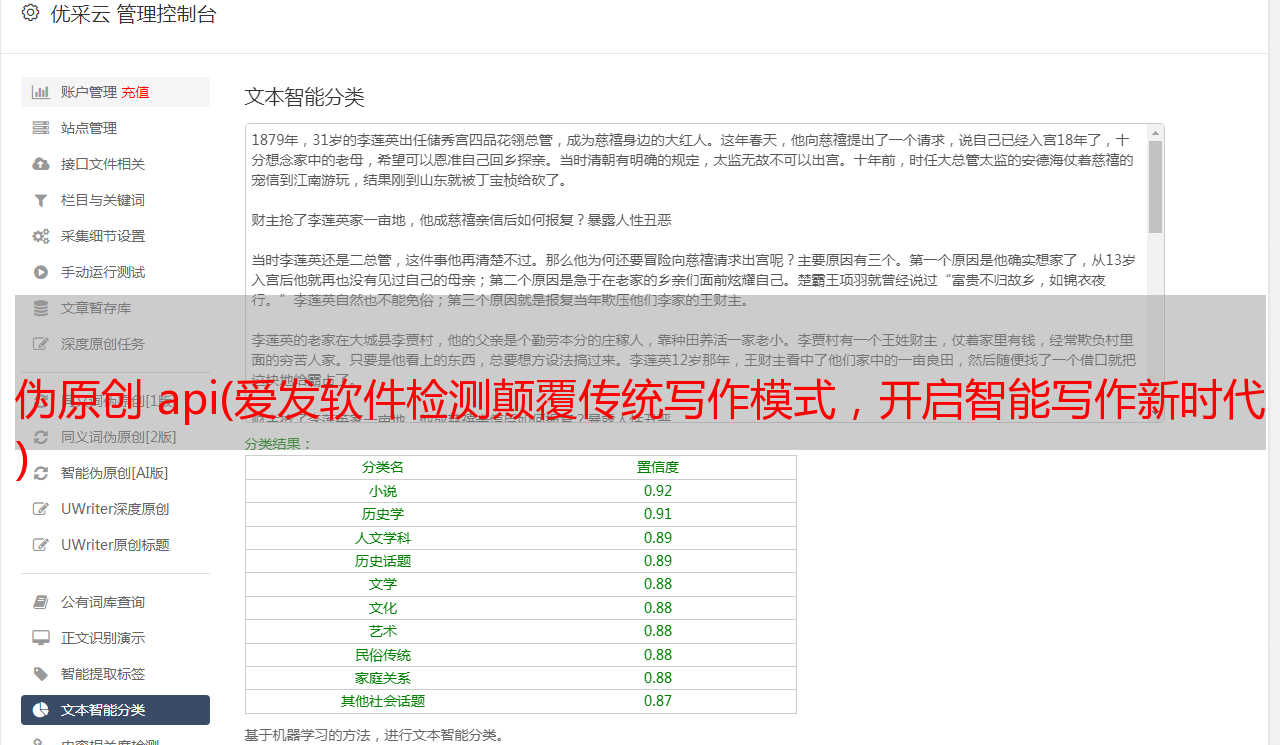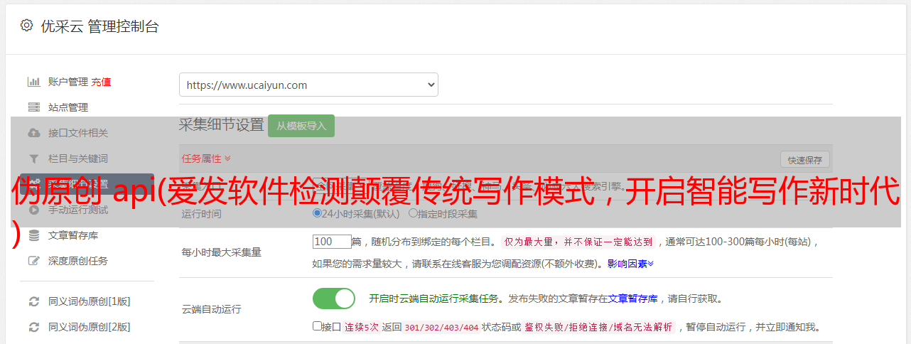 11、为了让广大SEO从业者更方便快捷的使用优采云(文章采集+AI伪原创的核心功能+原创检测),优采云为有开发能力的团队或个人提供API接口。过去需要提交到文章官网进行伪原创或原创测试。现在优采云已经开放了API接口,只要集成到你的网站@>中,当你发布文章时,它会自动做伪原创或原创为您检测,节省您的时间。也可以将优采云的核心功能(文章采集+AI伪原创+原创检测)集成到自己的网站@>中,使< @网站