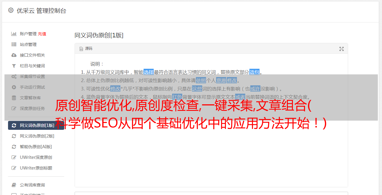 原创智能优化,原创度检查,一键采集,文章组合( 科学做SEO从四个基础优化中的应用方法开始!)