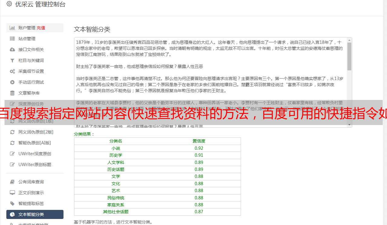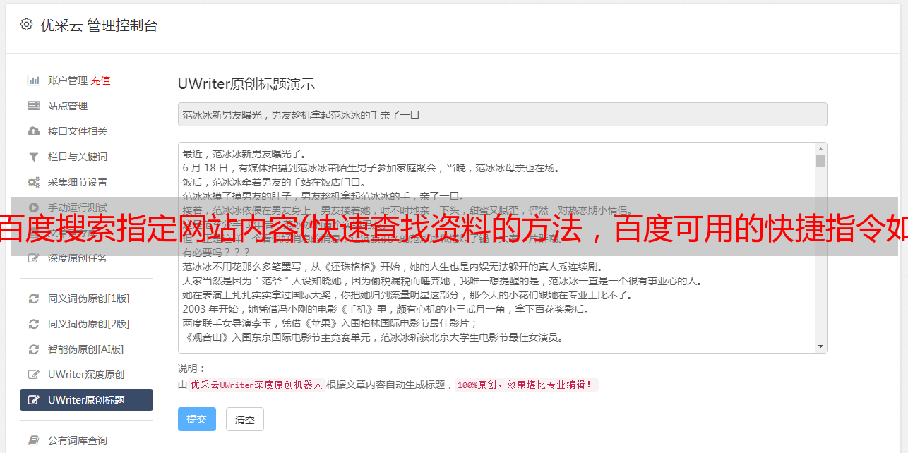 优采云 发布时间: 2021-11-14 17:09百度搜索指定网站内容(快速查找资料的方法,百度可用的快捷指令如下: