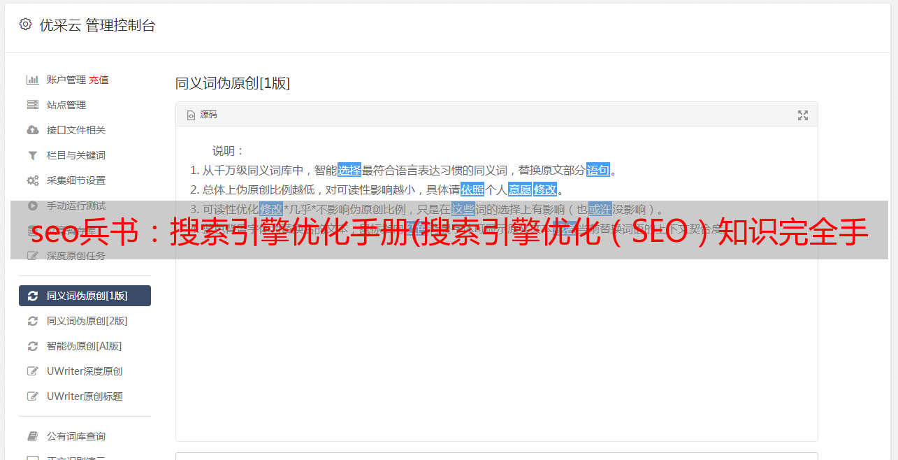 优采云 发布时间: 2021-11-15 11:11seo兵书:搜索引擎优化手册(搜索引擎优化(SEO)知识完全手册(胡宝介))