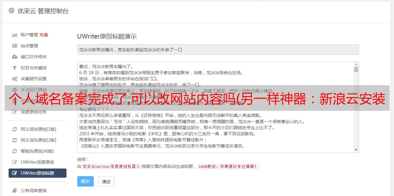 优采云 发布时间: 2021-11-15 14:29个人域名备案完成了,可以改网站内容吗(另一样神器:新浪云安装模板和插件(组图))