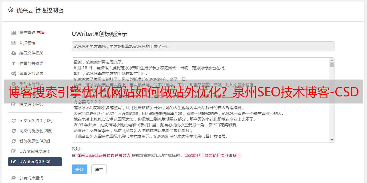 优采云 发布时间: 2021-11-16 09:22博客搜索引擎优化(网站如何做站外优化?_泉州SEO技术博客-CSDN博客)