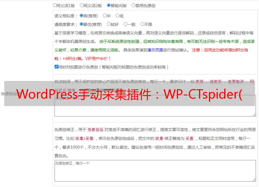WP-CTspider(长腿蜘蛛)是一款基于php开发的Wordpress全手动采集插件,设置轻而易举,只须要设置定向采集网址,通过CSS选择器精准辨识采集区域,包括(内容,摘要,TAG,缩略图,自定义数组等…)然后手动检查抓取网页内容,文章去重,更新发布,这个过程全手动完成,无需人工干预。