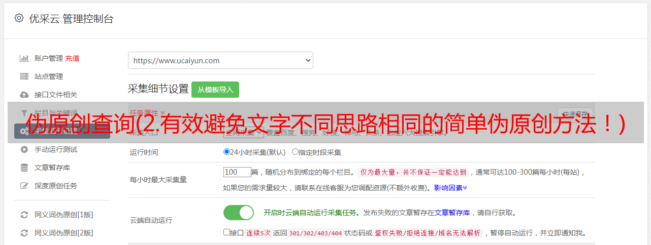 5、软件上的那些小数字参数,比如原创检测标准等,建议不要修改,使用默认的。 原创检测标准是判断段落的发红度原创次,数次以内原创;