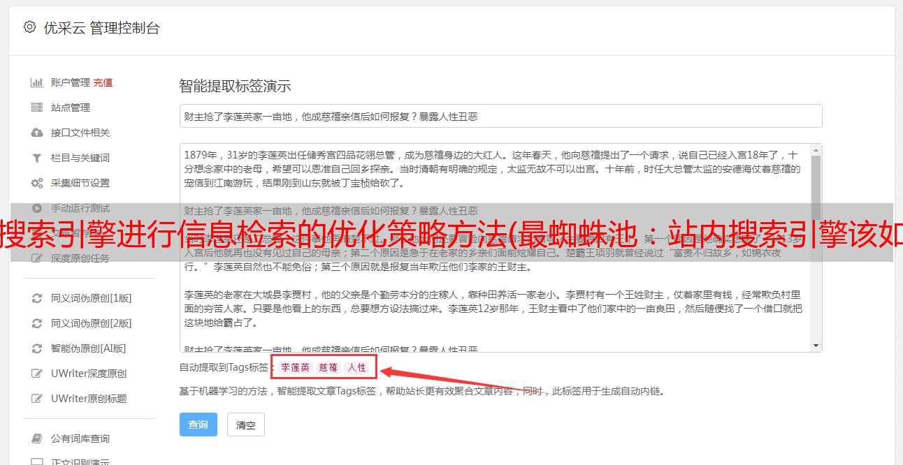 优采云 发布时间: 2021-11-17 15:23搜索引擎进行信息检索的优化策略方法(最蜘蛛池:站内搜索引擎该如何SEO?(一))