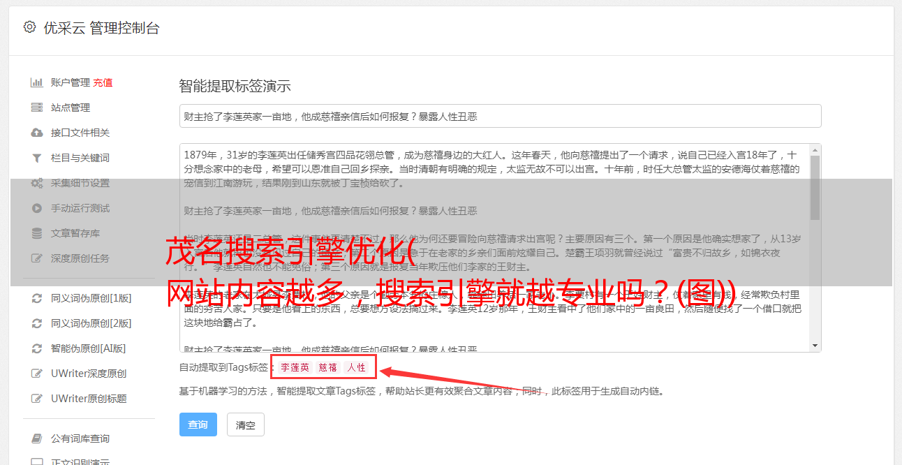 网站 内容越多,搜索引擎越专业!例如,您可以澄清这个问题。比如你我都想在搜索引擎(引擎)前面加上“SEO(搜索引擎优化)网络推广”这个词。他们都使用一个带有单独域名的 网站 作为这个 关键词。