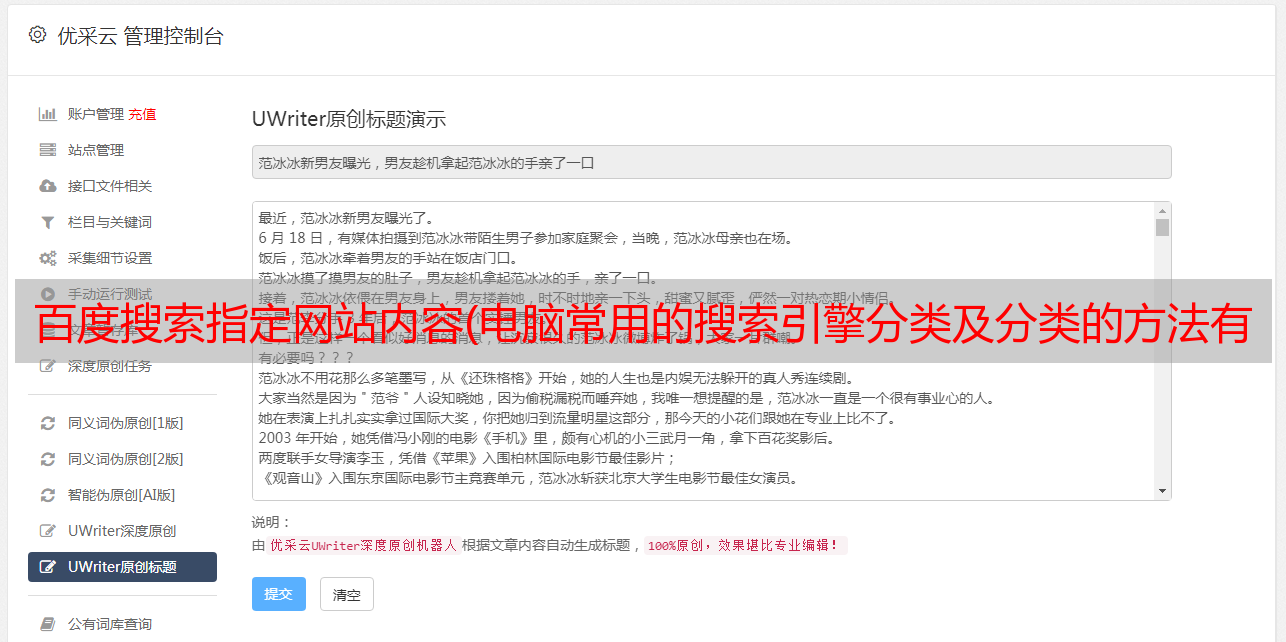 优采云 发布时间: 2021-11-18 01:14百度搜索指定网站内容(电脑常用的搜索引擎分类及分类的方法有哪些?)