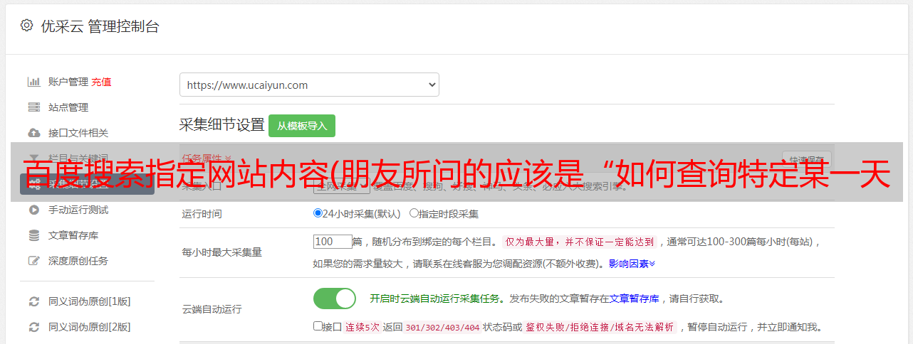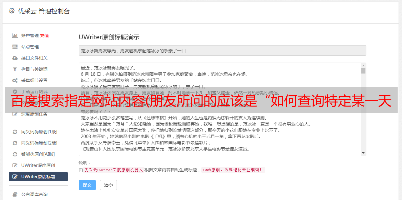 优采云 发布时间: 2021-11-18 02:00百度搜索指定网站内容(朋友所问的应该是“如何查询特定某一天百度对网站的收录情况”吧)