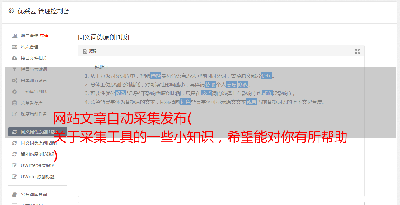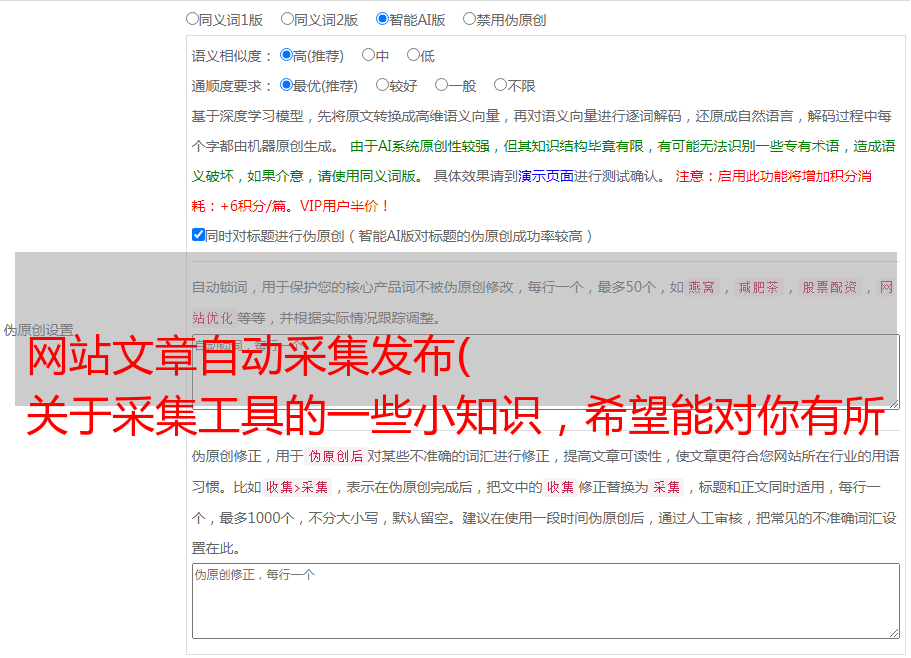 第四点,我们如何处理来自采集的内容?通过伪原创提高采集文章SEO收录的比例,我们肯定不会达到采集100%原创。使用伪原创的目的是想办法绕过搜索引擎或新媒体的收录重复检查算法。让收录的内容更快,增加文章的流量。