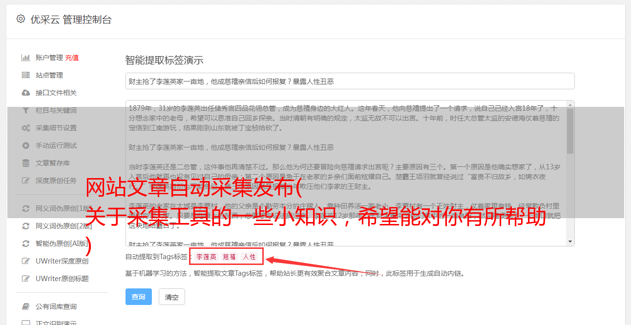 第二点,为什么我们需要采集来做网站?可以快速丰富网站的内容,减少手动发布内容的繁琐。最重要的是它可以快速方便的给网站添加大量的内容。因为站长希望把别人的网站内容放到自己的网站中,从内容中提取相关字段,发布到自己的网站系统中。站长最日常的工作就是提供丰富的网站内容来吸引更多的访问者。采集系统就像一双眼睛,让你看得更远,得到更多。