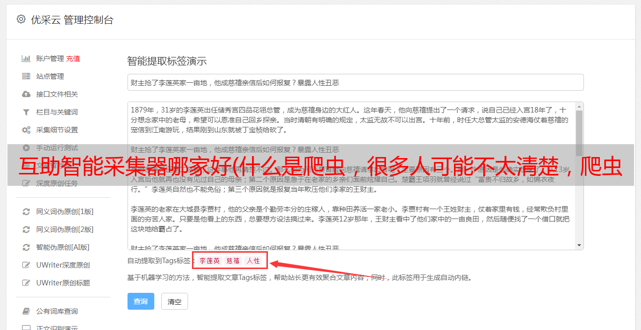 我们经常看到的爬虫就是站群这个人。什么是站群就是制造很多垃圾网站网站里面的东西,什么都没有。那么他们这么多的数据是从哪里来的呢?他们通常使用采集 来。如果您是高手,请编写自己的采集软件。一般这些采集工具都是用优采云或者优采云,但是优采云对编程能力还是有一点要求的。所以小白直接用优采云采集,基本就OK了。