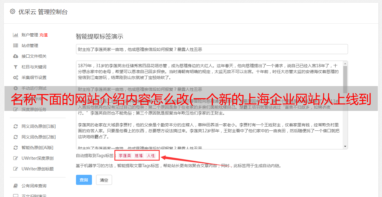 优采云 发布时间: 2021-11-19 06:11名称下面的网站介绍内容怎么改(一个新的上海企业网站从上线到被收录的原因)