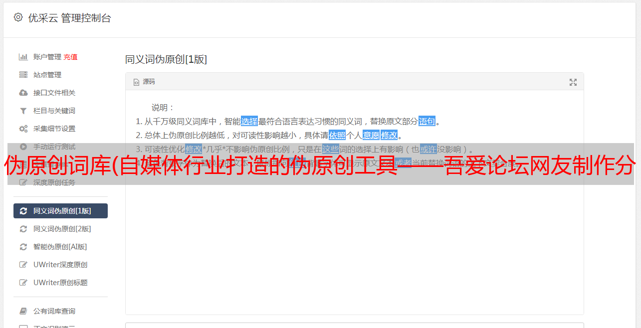 优采云 发布时间: 2021-11-19 16:20伪原创词库(自媒体行业打造的伪原创工具——吾爱论坛网友制作分享
